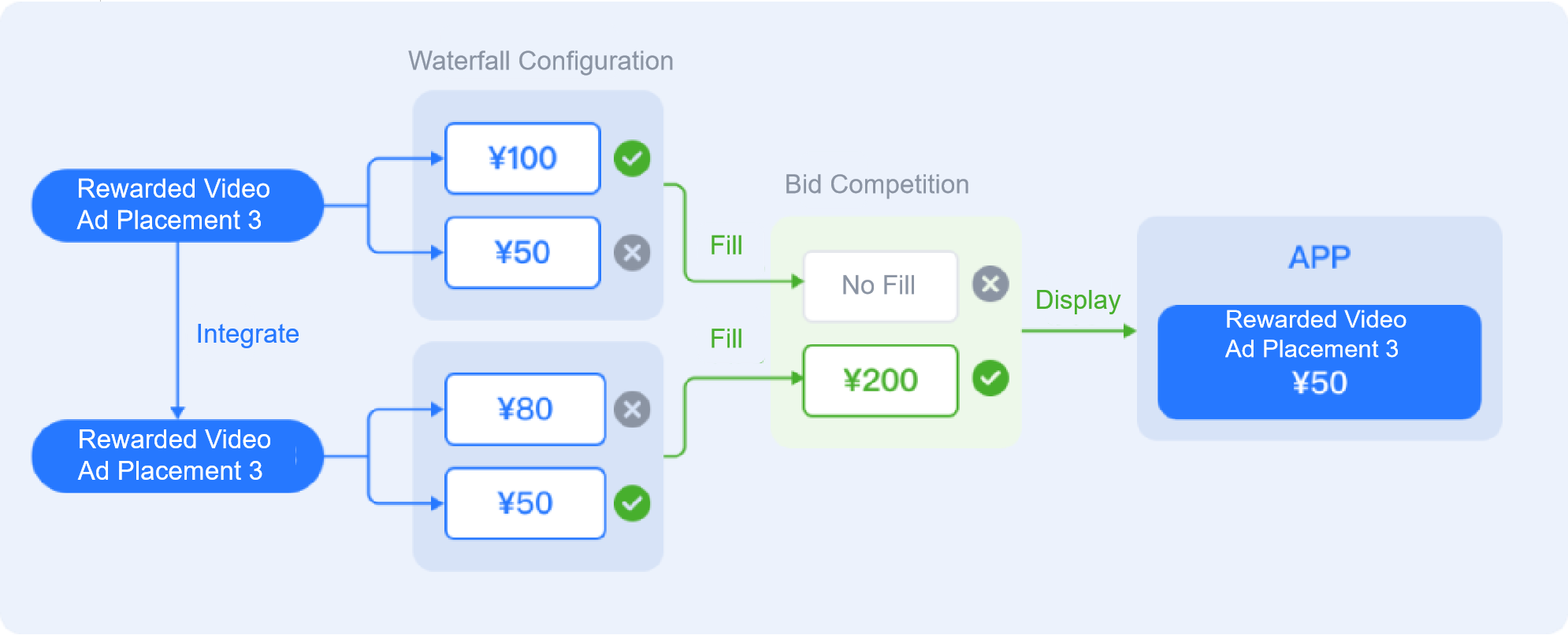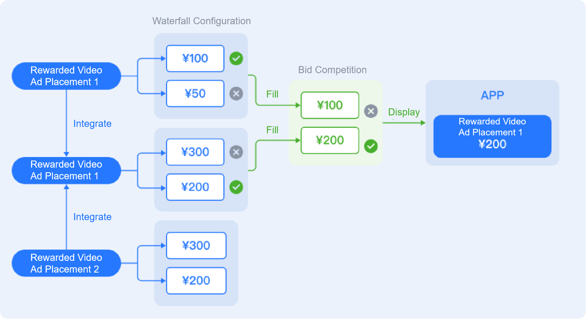 Example: Primary Placement A's current eCPM is ¥100, but the linked Shared Placement has cached an ad source with a ¥200 eCPM. In this case, the ¥200 ad is prioritized for display, effectively doubling the revenue for that single impression.
