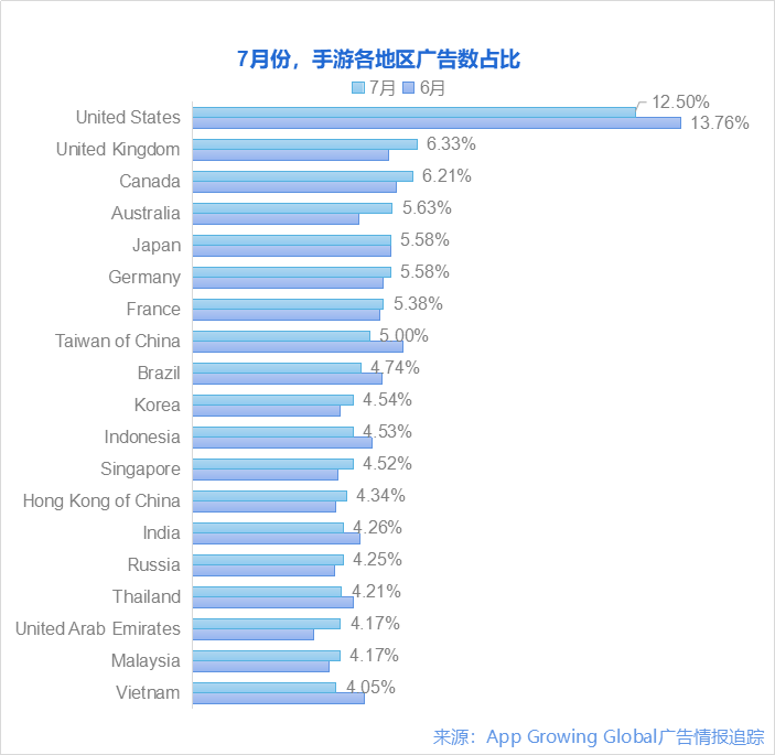 8月19日,App Growing Global 发布《2020年7月份手游海外买量市场分析》。7 月份手游广告中,休闲游戏买量占据大盘 1/3 ,略比上个月下滑;策略、角色扮演游戏环比 6 月各上涨 2.6% 、1.1%。美国地区的 7 月份投放占比相比 6 月份的 13.76%,下滑至12.50%。英国、加拿大、澳大利亚 7 月份广告占比小幅增长。
