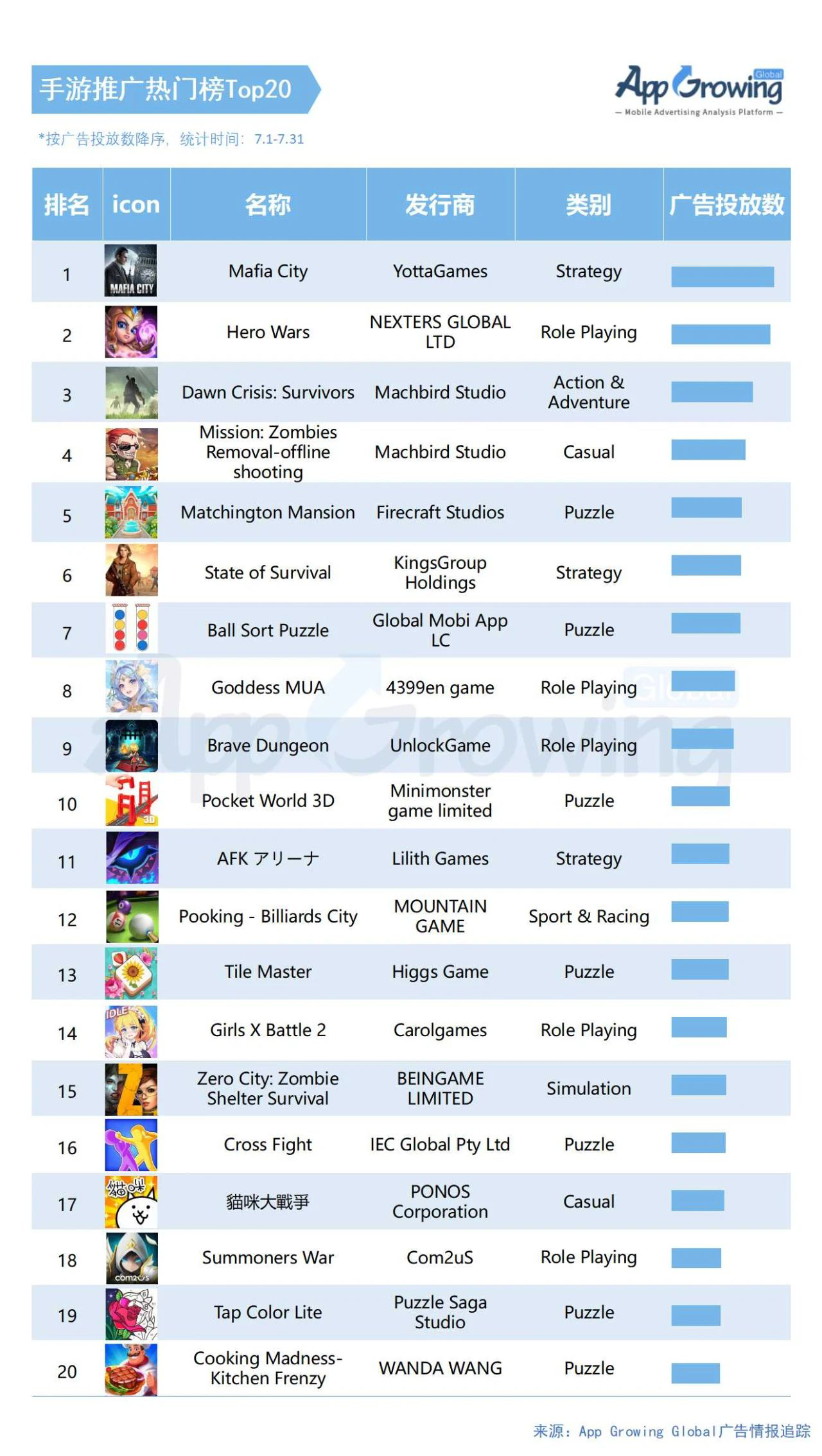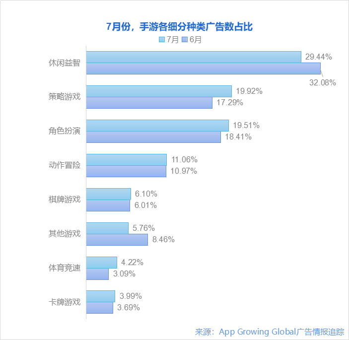 2.7月手游海外买量:休闲游戏买量占比下降,SLG、RPG增长