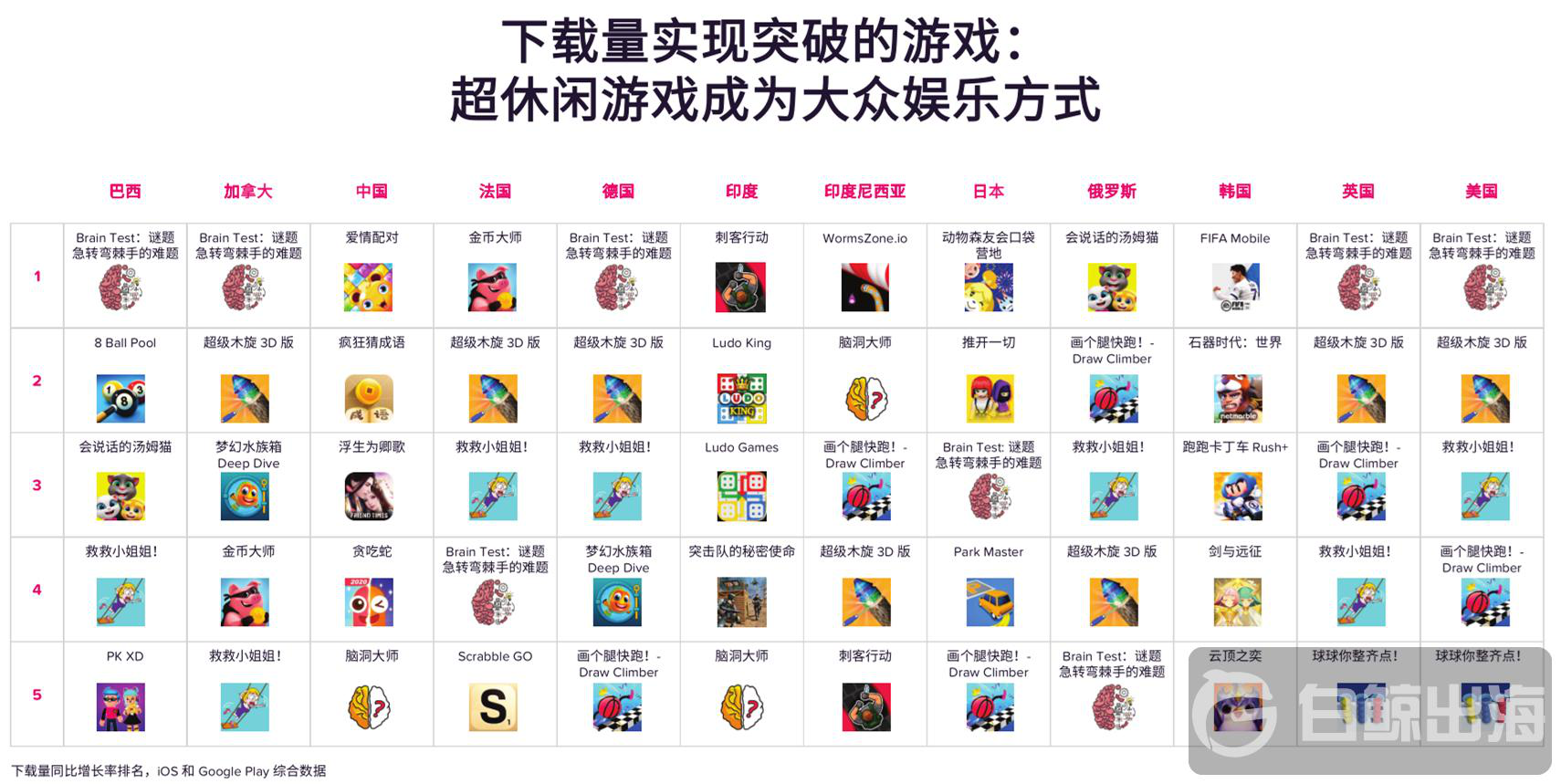 8 月 18 日,App Annie 发布了《新冠肺炎疫情已永久改变移动消费行为》报告。报告公布了 12 个国家下载量同比增长率 Top5 游戏。从品类来看,超休闲游戏不出意外占据榜单大部位置,多款不同玩法的益智类游戏进入榜单;从地域来看,英、美榜单 Top5 游戏完全一致,,德国、法国、俄罗斯、加拿大榜单与英美榜单重合度较高,说明欧美国家玩家的口味类似。《救救小姐姐》、《超级木旋 3D 版》、《Brain Test》这 3 款游戏在欧美国家榜单 Top5 中几乎都有出现,它们的共同特点是玩法简单易上手,几乎不需要游戏引导玩家就知道怎么玩。