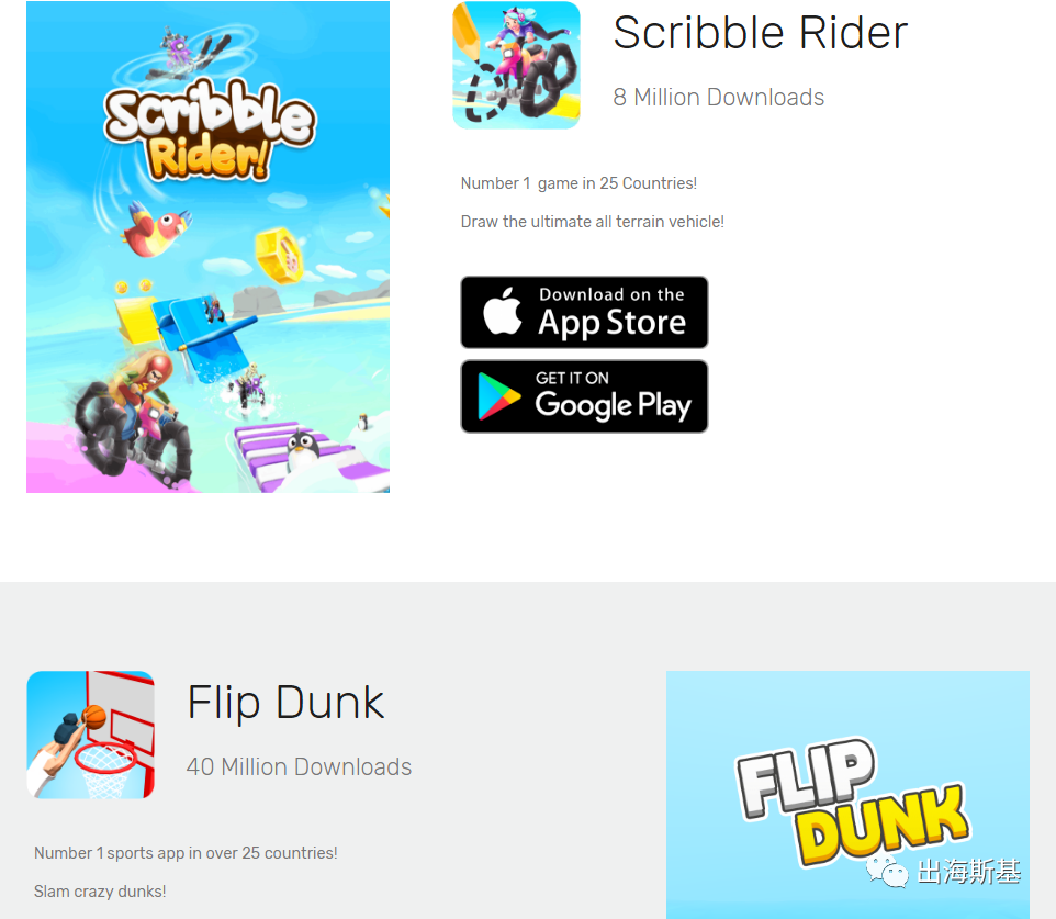 据罗斯基报道,游戏原开发者为Tapped Studios,根据其官网显示的信息,这是一家位于伦敦的游戏团队。团队创立于2018年,由2人联合创立,且目前依旧保持2人的规模。Tapped Studios在《Scribble Rider》之前曾开发过《Flip Dunk》,交由Voodoo发行。根据官网信息,《Flip Dunk》累计下载量超4000万。而最新的《Scribble Rider》目前成绩为25个国家或地区排名第一,已经有800万以上的下载量。