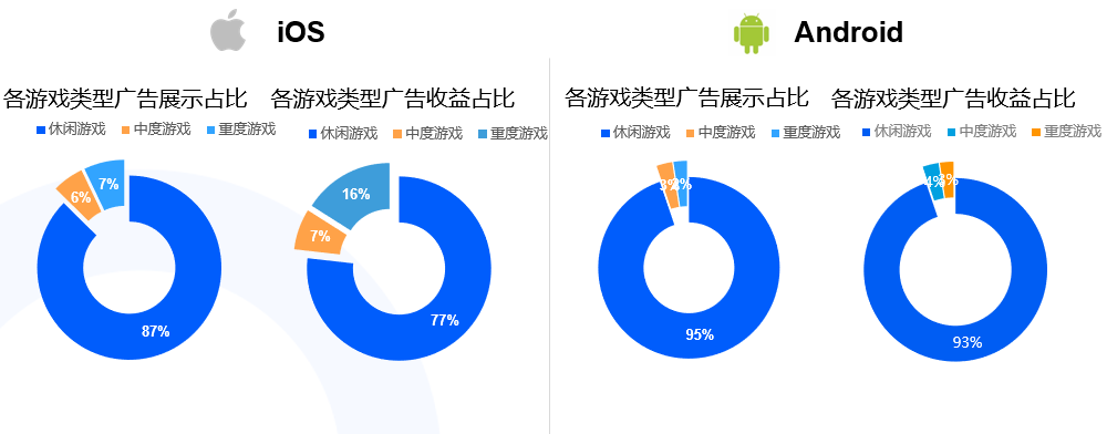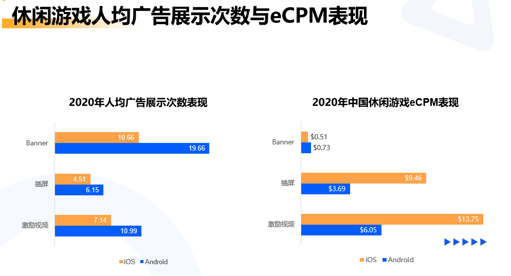 如此巨大的展示量,一定程度上也拉低了eCPM,2020年国内eCPM没有美国市场表现优秀。但根据我们观察到的情况来看,中国地区双端的ARPU值和美国地区接近,平均ARPU值可以做到0.15$-0.3$,相当于较低的eCPM加上巨大展示量,综合下来的广告收益还算理想。