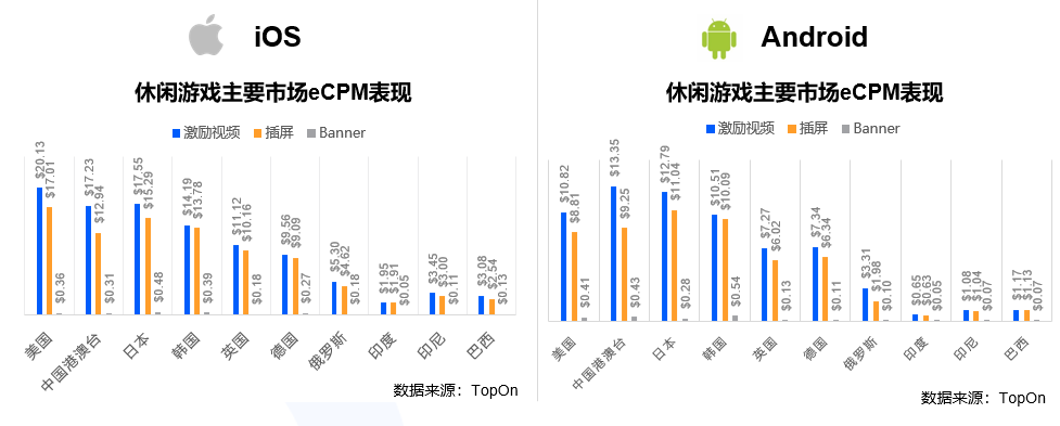 从收益和利润角度来看,美国是出海开发者最大的市场。前面下载量Top 4的国家中,印度eCPM非常低,插屏和激励视频只有几十美分,且受到政策影响,出海印度市场存在一些困难;巴西和印尼数据表现差不多,都在1-3美金左右。而美国地区的用户量和eCPM表现均非常优异。根据TopOn观察的2020年休闲游戏主要市场eCPM表现效果,美国在主要下载市场中效果最好,其中iOS端激励视频eCPM领跑全球,eCPM达到 $ 20.13。庞大的用户规模和良好的变现收益表现使美国成为最为重要的休闲游戏海外市场。