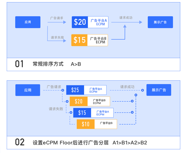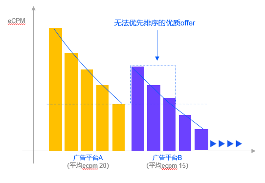 确认好广告样式和平台后,接下来的问题是如何优化广告收入。早期大家的做法是接入多家平台后,根据每个平台的平均eCPM做排序。比如平台A的平均是$20,平台B是$15,那按照正常逻辑就是优先展示A,其次是B。但存在的问题是,虽然B的综合eCPM不是最高,但里边也会有优质的offer,因其排在第二顺位,导致错过展示机会。所以现在大家常用的方式是设置底价,配置瀑布流。