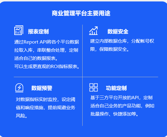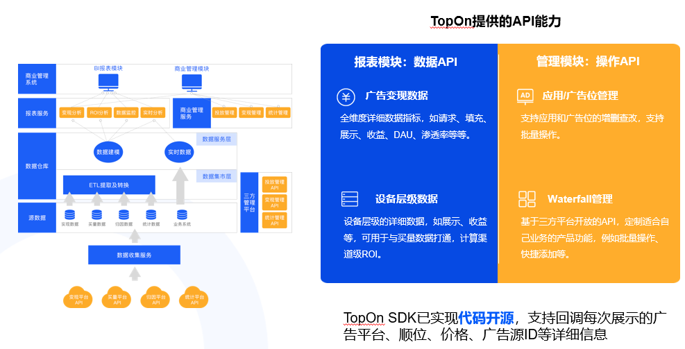 在搭建BI的过程中,TopOn可以提供报表API和操作API。报表API是指通过API接口把TopOn后台呈现的所有数据都回传给开发者。另外我们可以回传设备层级的数据,方便开发者计算ROI。