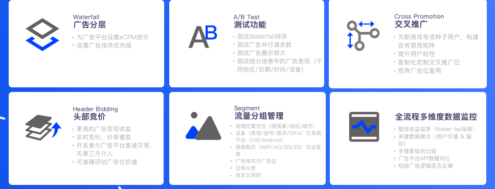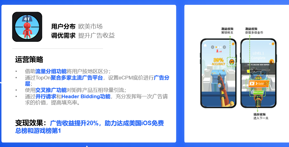 对于他们来说,最大的帮助是bidding和交叉推广功能。因为这家公司是有产品矩阵的,如果所有游戏都依赖买量,测试成本非常高。通过交叉推广引流的方式,可以免费获得一部分测试用户。还可以把自己的其他产品放在瀑布流的兜底层,尾部的流量不售卖给第三方平台,而是导给自身其他产品。
