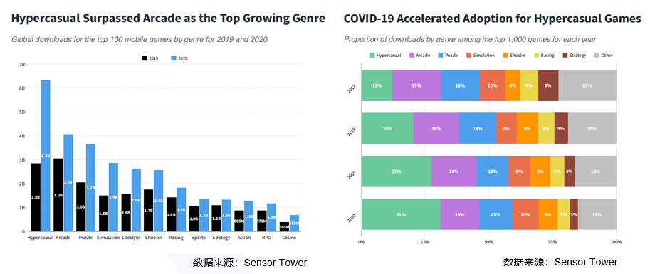 根据Sensor Tower年度报告数据显示,2020年,超休闲游戏下载量超过60亿次,同比增长123%。这一类型的整体提升也反映在市场份额的增加上,占据了全球手游市场31%的游戏下载量,放大到休闲游戏品类,59%的游戏下载量被超休闲、街机、益智解谜类占据。