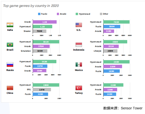 从下载量来看,印度在街机游戏和超休闲游戏中的下载量最高,分别为13亿和11亿。美国紧随其后,超休闲、街机分别达到7810万和5080万。