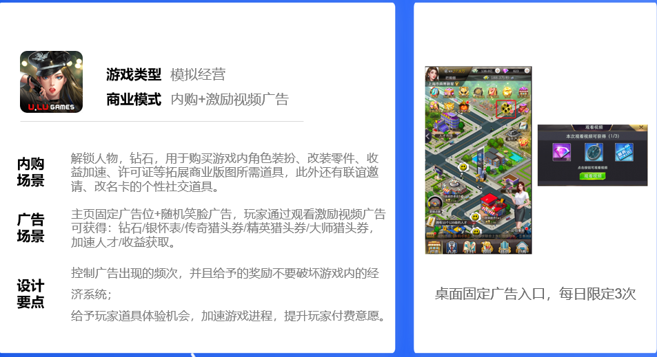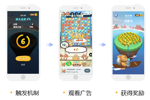对于中度游戏来说,建议开发者在立项的时候就考虑好激励视频场景。因为中度游戏大多是内购+广告的模式,这就涉及到游戏的数值体系。建议在前期就设计好,避免后期想加广告发现无法平衡广告和内购的关系。