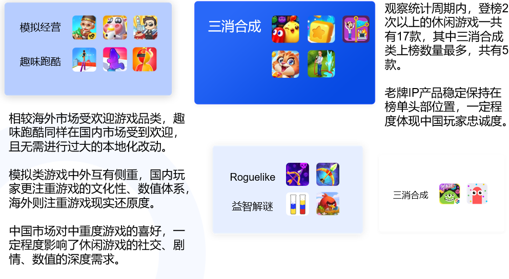 根据罗斯基统计的国内App Store数据来看,国内iOS用户更喜欢重度和中度休闲游戏。而中度休闲和海外也不太一样,海外是跑酷产品数量较多,而国内则是偏数值向的中度游戏更受欢迎,如三消、模拟经营类游戏,跑酷游戏也有一定占比。