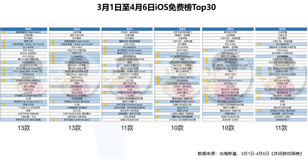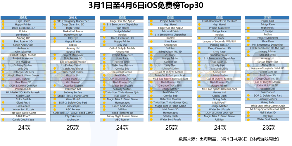 根据出海斯基发布的《休闲游戏周榜》显示,3月份至今,iOS榜单Top30中,80%都是休闲游戏。在这些游戏中,跑酷类是重复上榜次数最多的品类。这个情况和2020年还是有很大差异的。