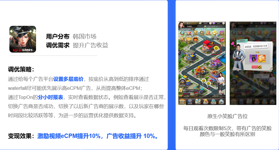 第三个案例是《리치리치(Reach Rich)》,是一个混合变现产品,面向韩国市场。对于这种内购为主的游戏来说,广告只是辅助,他们并不要求广告收入多高,而是希望广告设计能反哺游戏。他们的激励场景的设计有两个目的,根据奖励发放不同,例如发一个装备可以让普通玩家体验氪金的快感,提升用户的付费意愿。另一种是给用户游戏资源,这样可以留下来一些陪玩玩家。内购向游戏有很多非付费用户,很多开发者困扰的是如何让这部分用户留下来形成一个很好的游戏生态,激励视频广告就是一个很好的方式。