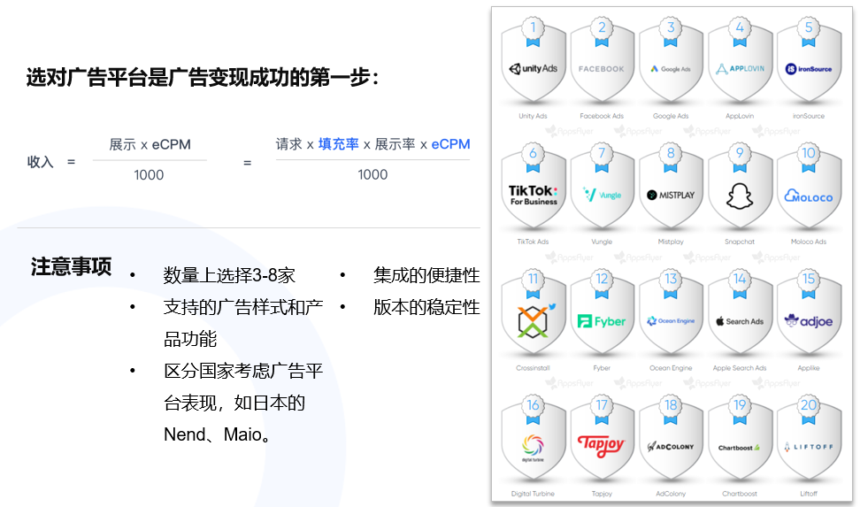 确认好广告样式之后,接下来就要选择使用哪些广告平台。我们建议开发者选择目标市场的Top3-8家广告平台即可。对于出海开发者来说,Facebook和Admob基本都会接入,然后在根据目标市场的不同,选择一些其他平台。