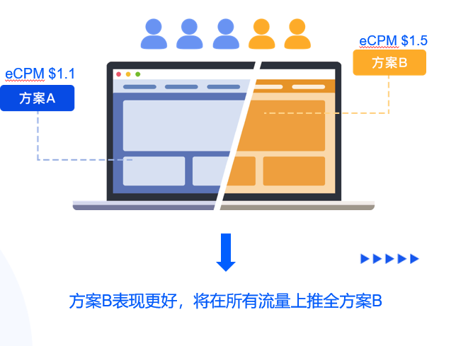 当开发者不知道哪种广告策略可以让收益最大化的时候,可以通过AB测试验证。这里要注意的是,大家尽量使用同质流量做AB测试,如果用不同时间段或不同买量渠道验证的话,会导致结果不准确。