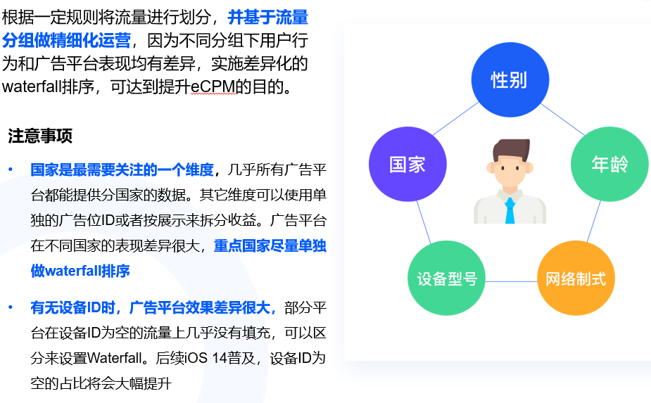 另外一个常见的优化方式是流量分组,基于不同的标签规则把用户分成不同的流量组,针对每个流量组做精细化运营。对于全球发行的开发者,最常见的就是按国家区分。例如美国地区头部可以设置50-100美金,但东南亚设置10美金可能就没有填充了。所以针对不同国家一定要单独做瀑布流优化。