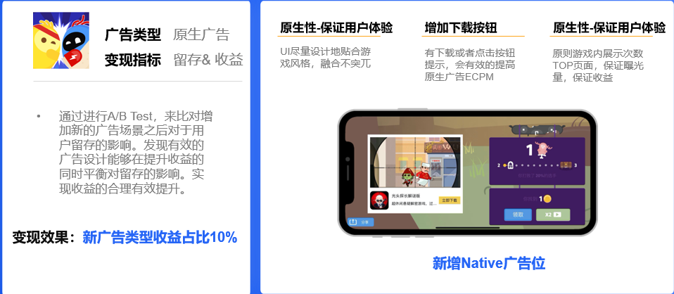 第二个案例是《蛋蛋大乱斗》的原生广告。这个游戏的结束页面有两种广告样式,一个是原生广告,一个是激励视频入口。在最开始他们的结束页只有激励视频入口,后续觉得横版游戏只放激励视频入口有些浪费空间,所以尝试加入了原生广告。但因为不确定增加广告后对数据的影响,所以通过AB测试,用小部分流量验证数据。最终发现增加原生广告后,用户体验并不受影响,这部分收入相当于纯增加。