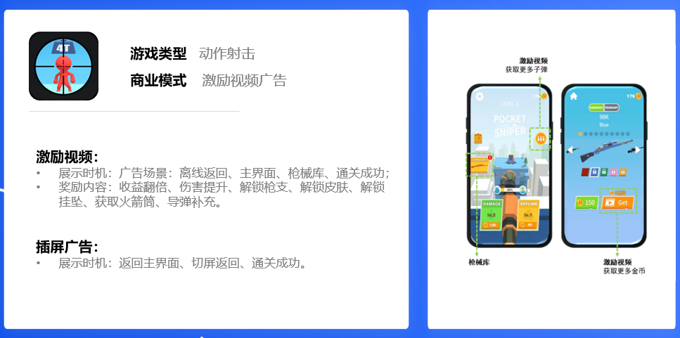 第一个案例是《Pocket Sniper!》,他们的场景是激励视频和插屏为主。激励场景非常多,解锁皮肤,枪支等。