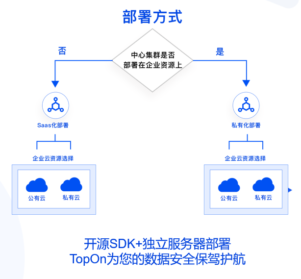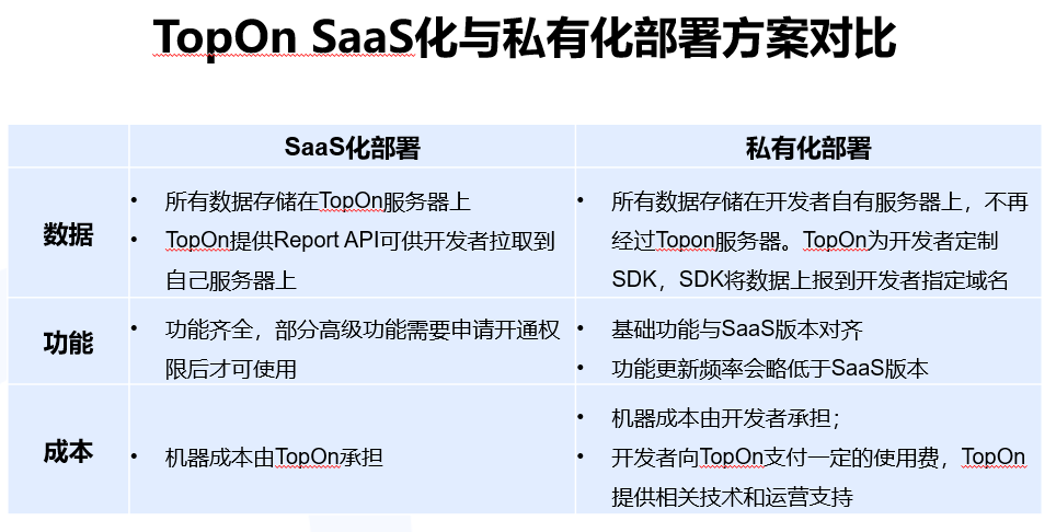 对于隐私性有更高要求的客户,可以考虑使用私有化部署。私有化部署的数据打点上报都是在开发者自己的服务器上,公有云版本所有数据是在TopOn服务器上的。