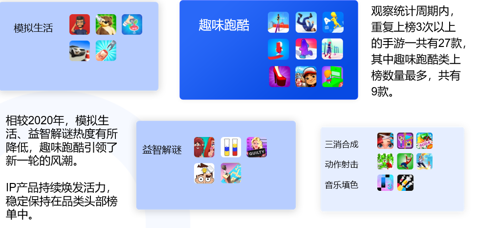 2020年解密类,益智类游戏的占比较高,而今年则是跑酷类产品频繁上榜。可见跑酷类游戏是目前的一个趋势,大家有兴趣的话可以多多关注,或者尝试下研发发行。