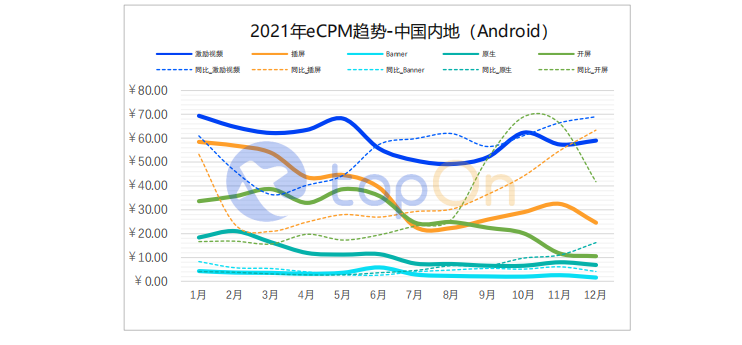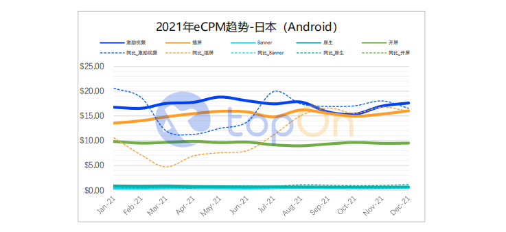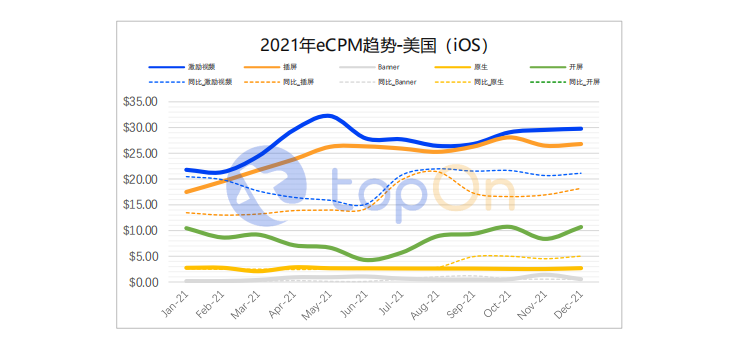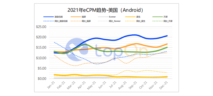 由于iOS端精准获客的受限影响,各主要市场Android端eCPM普遍自4、5月份开始爬升,在2021下半年迎来年度峰值。结合业界平台观测的投放数据变化,下半年广告主明显调整了双端的获客预算,或许与Android端仍然支持精准获客有关。