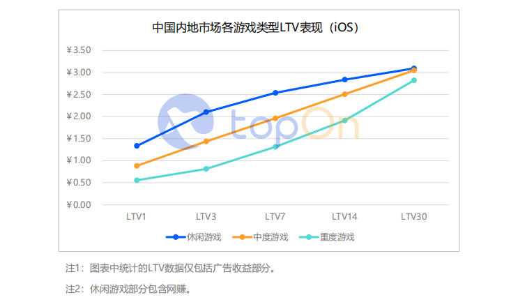 2021年中国内地市场除了迎来iOS 14.5+,还包括多部门、多维度的合规整改,一系列因素导致手游的上游广告主、开发者在多个层面迎来调整,动荡环境下整体获益表现不及预期。对比2021年上半年,中国内地市场三类游戏留存率、各广告样式人均展示次数均无明显变化,但双端用户LTV均出现下滑,三类游戏Android端的LTV30 从高于¥2集体降至¥2以下,iOS端的LTV30从¥4-5降至¥2.5-3.5。