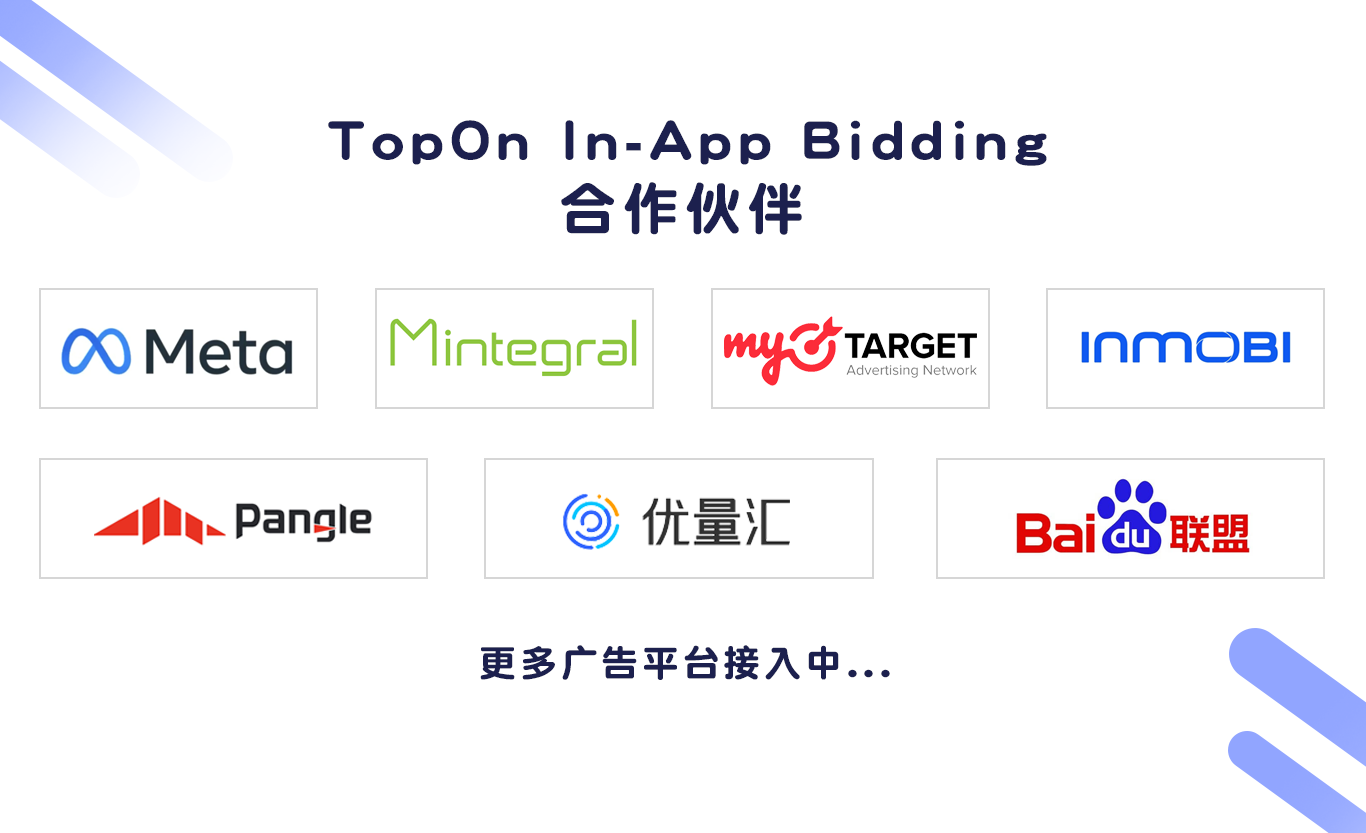 随着Meta Audience Network成为TopOn bidding合作伙伴, 截至目前TopOn已支持开通Chartboost Helium、Mintegral、myTarget、InMobi、Pangle, Vungle, 腾讯优量汇和百度等广告平台Bidding权限,更多应用内竞价解决方案请联系TopOn商务人员,或通过邮件business@toponad.com咨询了解。