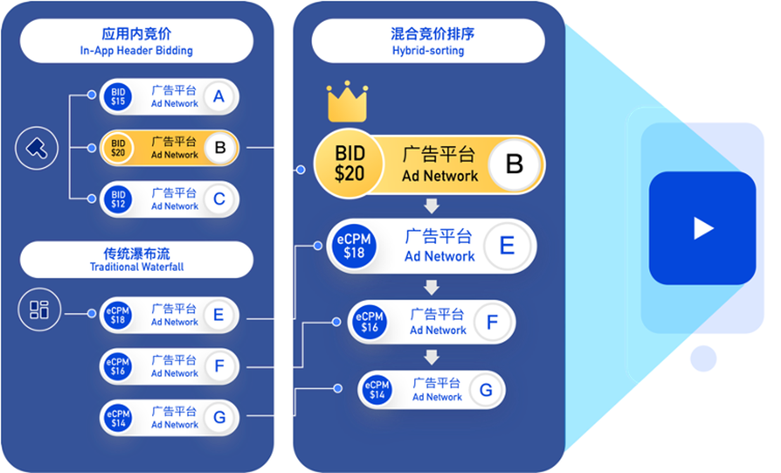 TopOn为开发者提供公平且透明的应用内竞价方案。我们推出了混合智能排序策略,融合了Bidding和Waterfall的各自优势,结合平台特点与实际情况,灵活设置优化策略,最大化每次广告展示收入。