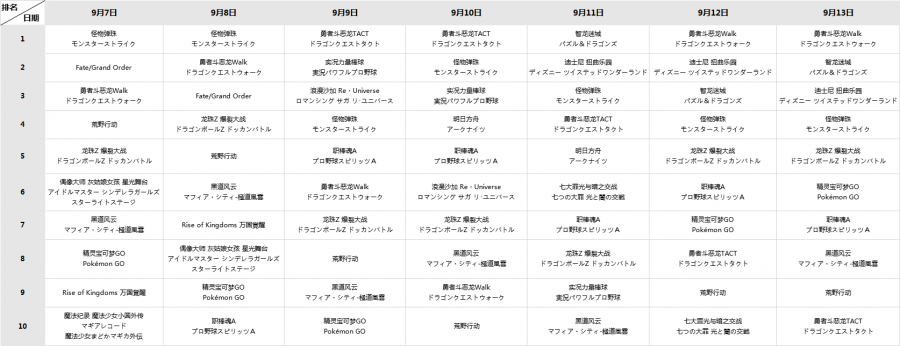 9月7日-9月13日 日本iOS游戏畅销榜