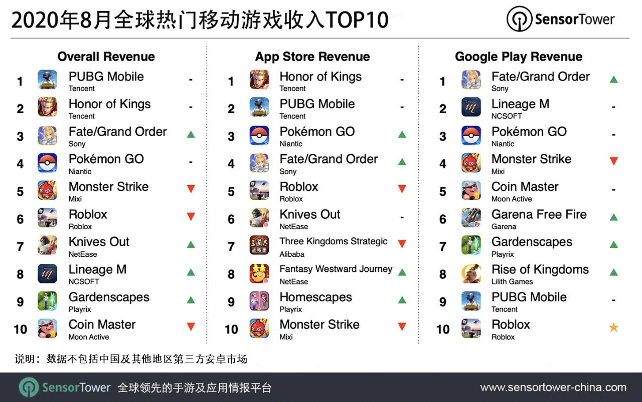 由于暑期学生放假,8月通常是移动游戏的收入高峰。在本期榜单中,《命运-冠位指定》和《荒野行动》全球收入均创历史新高,分别达到1.63亿美元和7950万美元。