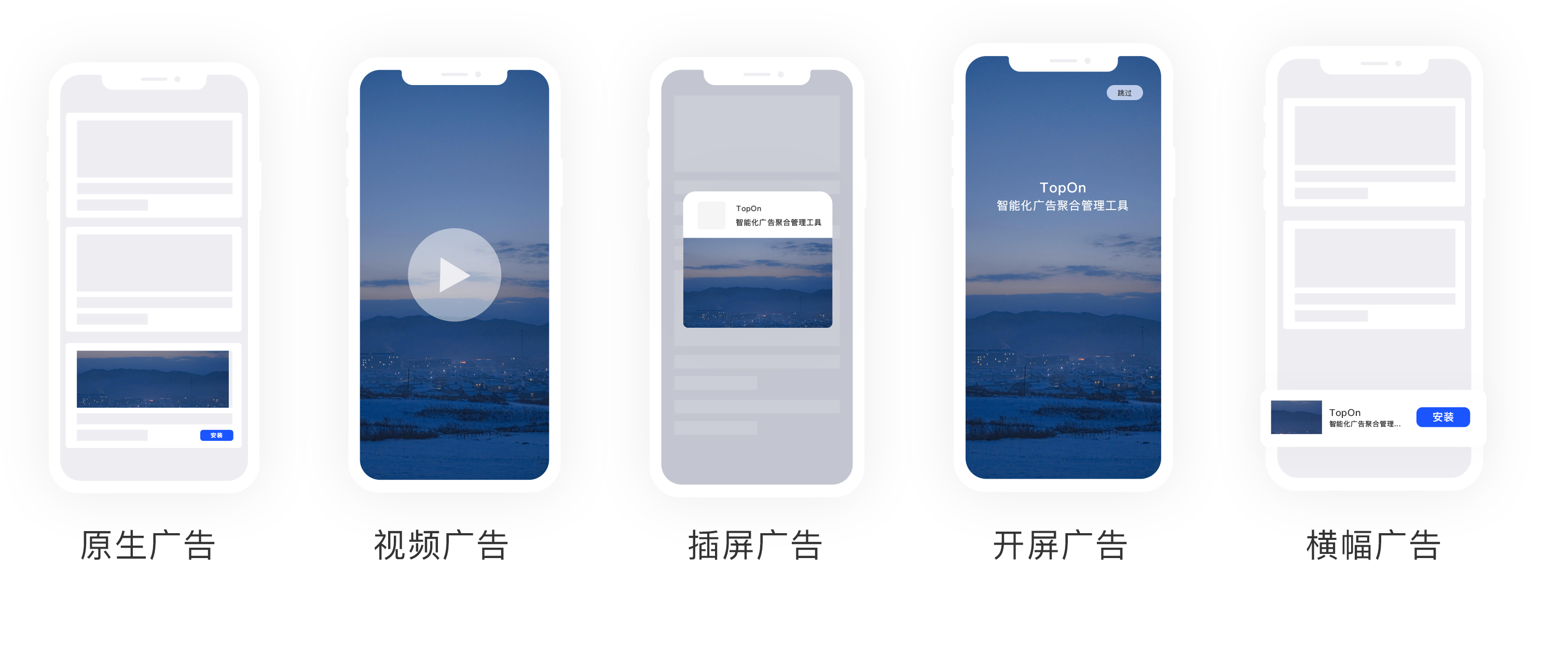 TopOn提供丰富的广告样式,如激励视频、插屏视频、插屏图片、原生、横幅、开屏等,满足开发者在不同的广场场景下使用不同广告样式的诉求,同时基于原生广告为开发者封装了原生开屏、原生横幅的广告样式,进一步提高了APP应用开发者的集成效率。