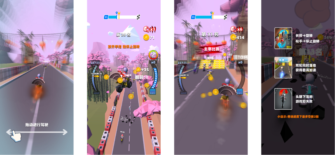 在游戏操作上,玩家只需长按、左右滑动屏幕控制摩托车向前行驶,在空中长按还可以进行旋转特技表演积累氮气,途中借助加速跑道还能完成冲刺等,超越对手过程中甚至可以通过“碰瓷”摧毁对手的摩托车,玩家唯一需要注意的就是躲避障碍,确保落地姿势安全准确。