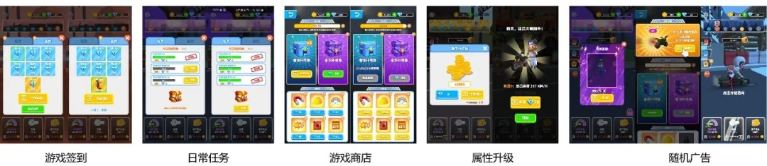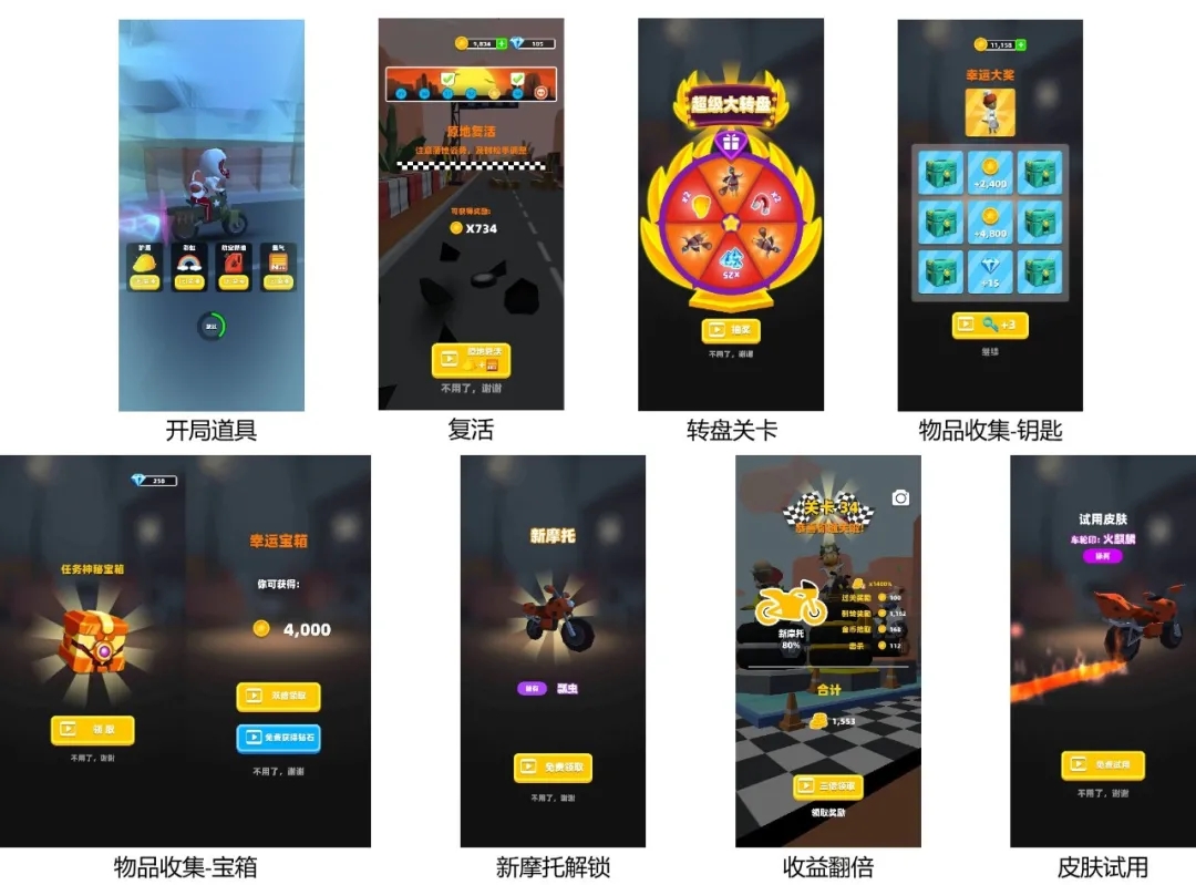尽管《Flipbike.io》采用了“内购+广告”的商业化模式,但其内购选项仅有“去除广告”,主要收益来源依然是游戏内广告。在广告样式方面,游戏选择采用插屏视频+激励视频广告,观看广告的奖励内容与其他游戏相似,如收益翻倍、复活、道具试用及获取、游戏内货币,但游戏的激励视频与游戏内容的结合度非常高,在不同的游戏界面、关卡、环节、物品上的呈现样式都与玩家当下的游戏操作及需求相契合,玩家畅爽竞速体验的同时收获了大量的成长性奖励,对游戏玩法产生了更强烈的正向反馈。