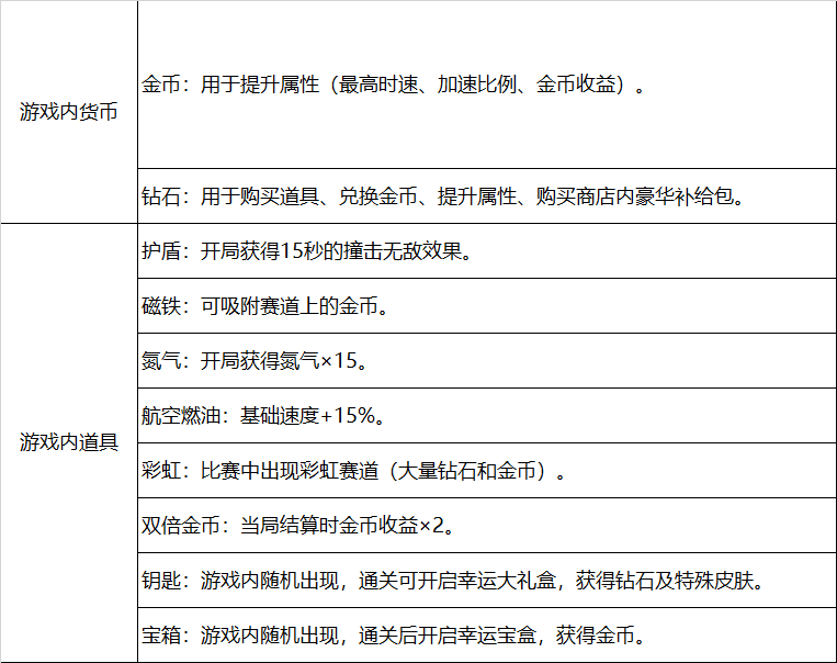 作为一款“简单粗暴”的竞速游戏,开发者为了让玩家更加畅快淋漓地进行游戏,结合游戏内货币设计了多种道具,辅助玩家加速通关。