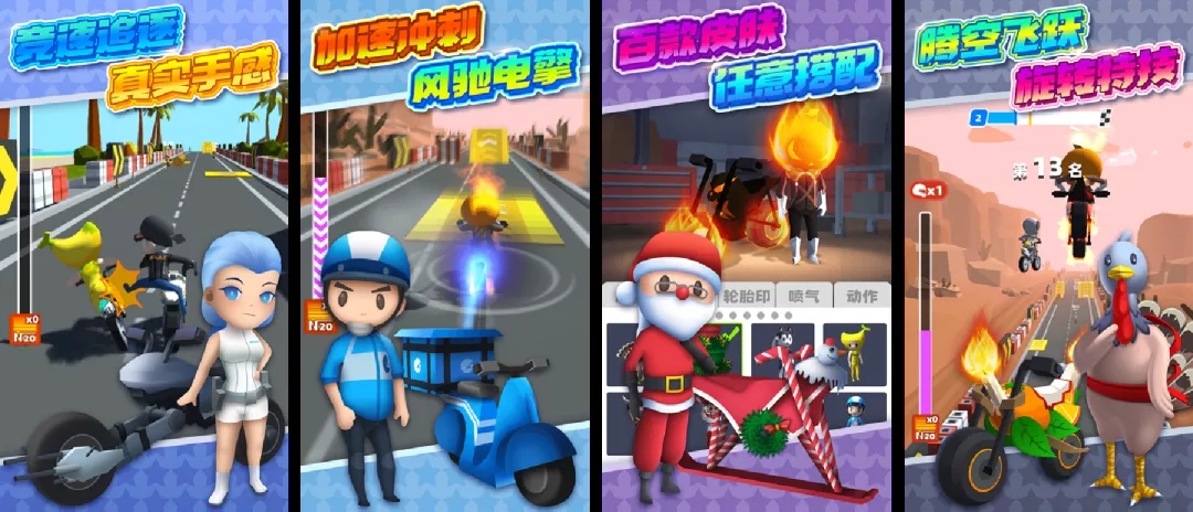 游戏内加入了简单的养成体系,玩家可以不断提升游戏属性(最高时速、加速比例、金币收益),还可以解锁蝙蝠侠、忍者、外卖员等众多的角色、经典丰富的摩托车、特效酷炫的车轮印和尾焰等,给予玩家顶级的驾驶体验。