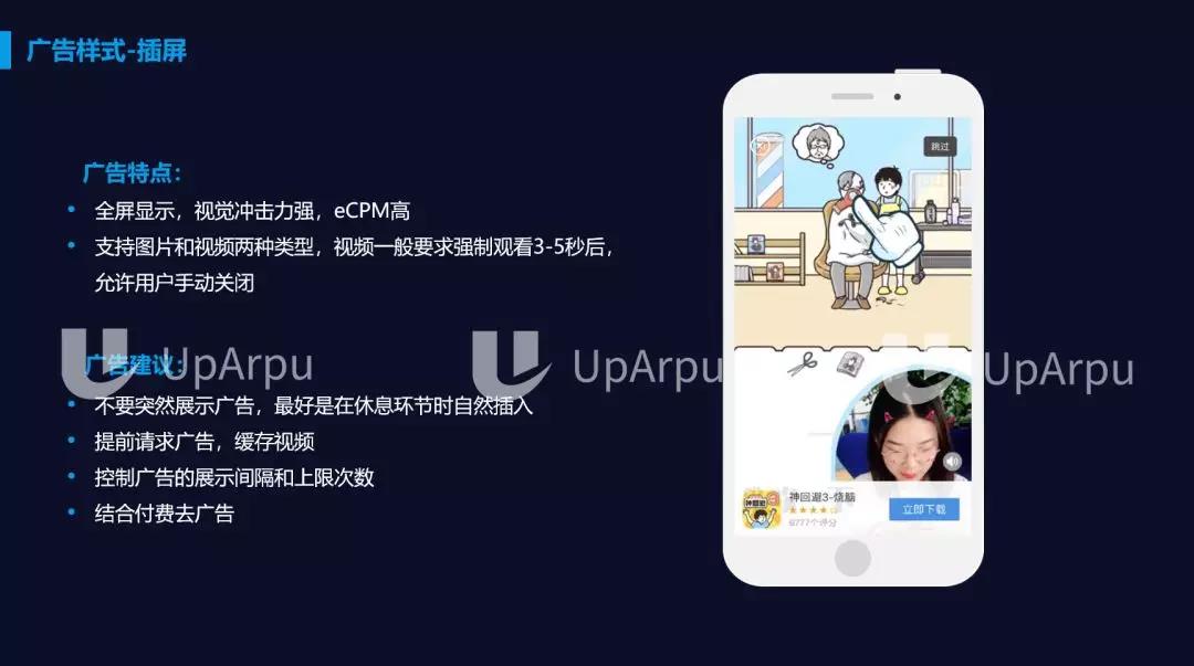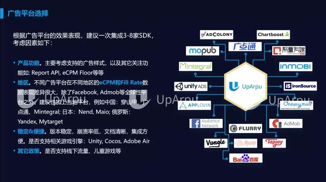 根据我们UpArpu后台的观察,游戏只接入一家广告平台时,当设备连续多次请求广告,平台返回的广告可能一样。如果接入多个广告平台,让平台之间的广告轮播展示,这样能一定程度增加广告内容的多样性。