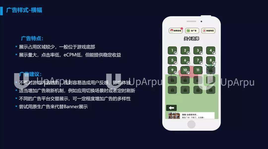 它的特点是占用区域非常少,一般位于游戏的底部。因为Banner是固定在一个位置,所以它的展示量会非常大,能够提供稳定收益。但可能会因为一些用户反感Banner广告,或者因为它占用的区域比较小不够显眼,点击率会比较低,eCPM也就比较低。