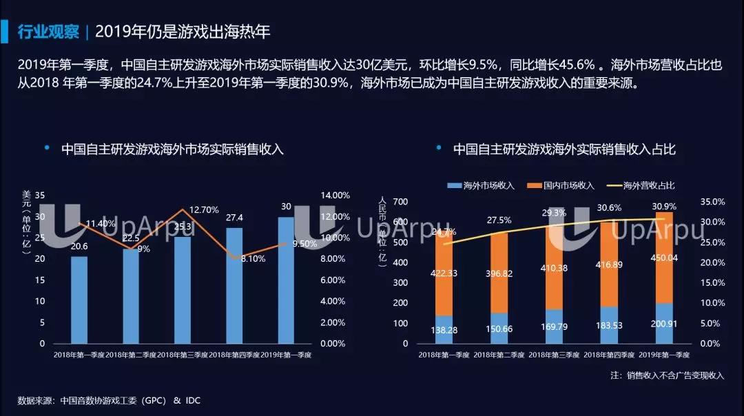 首先来看一些数据。从2018年Q1开始到2019年Q1,中国游戏在海外市场的销售额呈现出快速上涨的趋势。到今年Q1出海游戏销售额已经突破30亿美元,海外市场的销售占比也是在逐渐的提升。可以看出,2019年游戏出海依然是热潮。