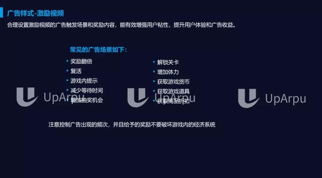 要控制激励广告频率,并且不要去破坏游戏类的经济体系。比如说不能让观看视频就获得一个道具,这个道具是要花十块钱才能买得到的,这样的话用户就会都去看视频广告而不内购,这会对游戏内的经济系统造成破坏,对游戏造成负面的影响。